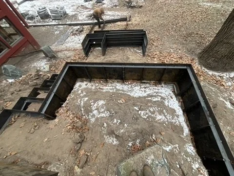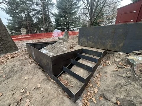 We installed the larger walls and stair modules to footings, and since the ground had already started to freeze, the edging and stair modules were delivered and staged for the landscaping crew to bolt together once they had laid the aggregate base. We circled back as a courtesy in the spring to make sure everything fit together like a glove and while several walls with footings were located 50+ feet away from each other, the edging between them slid into place with paper thin seams without any need for modifications. That kind of precision in a landscape is probably overkill, but itβs really fun to achieve.